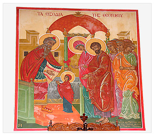 kaksteistpüha (21. november (4. detsember)), mida pühitsetakse sündmuste auks, mille kohta kõneleb Püha Pärimus, et kui Neitsi Maria oli saanud kolme aastaseks, tõid tema vanemad Joakim ja Anna ta Jeruusalemma templisse, et täita oma tõotus – pühendada tütar Jumalale. Pärimuse järgi elas Maria sellest ajast saadik templi juures, kus teda kasvatati selle ajani, mil ta kihlus õiglase Joosepiga. |